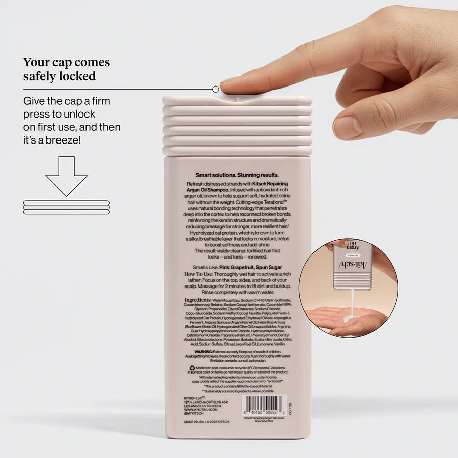 Water/Aqua/Eau, Sodium C14-16 Olefin Sulfonate, Cocamidopropyl Betaine, Sodium Cocoyl Isethionate, Cocamide MIPA, Glycerin, Propanediol, Glycol Distearate, Sodium Chloride, Coco-Glucoside, Sodium Methyl Cocoyl Taurate, Polyquaternium-7, Hydrolyzed Oat Protein, Hydrogenated Ethylhexyl Olivate, Aspergillus Ferment, Argania Spinosa (Argan) Kernel Oil, Helianthus Annuus (Sunflower) Seed Oil, Hydrogenated Olive Oil Unsaponifiables, Arginine, Guar Hydroxypropyltrimonium Chloride, Hydroxyethylcellulose, Cetrimonium Chloride, Fragrance (Parfum), Phenoxyethanol, Benzyl Alcohol, Gluconolactone, Potassium Sorbate, Sodium Benzoate, Citric Acid, Sodium Sulfate, Citrus Limon Peel Oil, Limonene, Vanillin