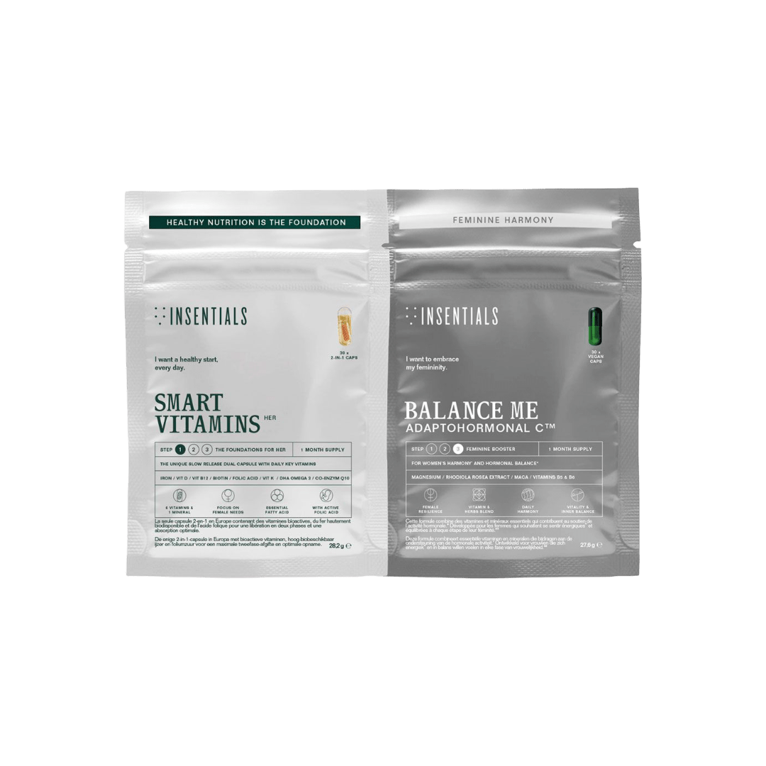 Smart Vitamins for her en Balance Me werken samen om je energieniveau, hormonale activiteit en mentale veerkracht te ondersteunen.